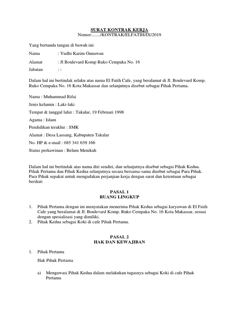 Contoh Surat Kontrak Kerja Dan Cara Membuatnya Akseleran Blog Source from : https://www.akseleran.co.id/blog/contoh-surat-kontrak-kerja/ Kontrak kerja dalam smk anggota polri. Jangan asal kerja, surat kontrak kerja karyawan swasta perlu kamu punya. Surat kontrak kerja adalah surat yang dibuat oleh pihak pemberi kerja (perusahaan) dengan si penerima kerja (karyawan) yang mana isinya kesepakatan antara kedua belah pihak tersebut. Artinya adalah kontraktor hanya diberikan kewajiban untuk menyediakan tenaga kerja dan mengatur pekerjaan di lapangan dari awal hingga selesai. Kontrak kerja yang tertulis hitam di atas putih adalah hal yang sangat penting, khususnya di dunia kerja atau di sebuah perusahaan.