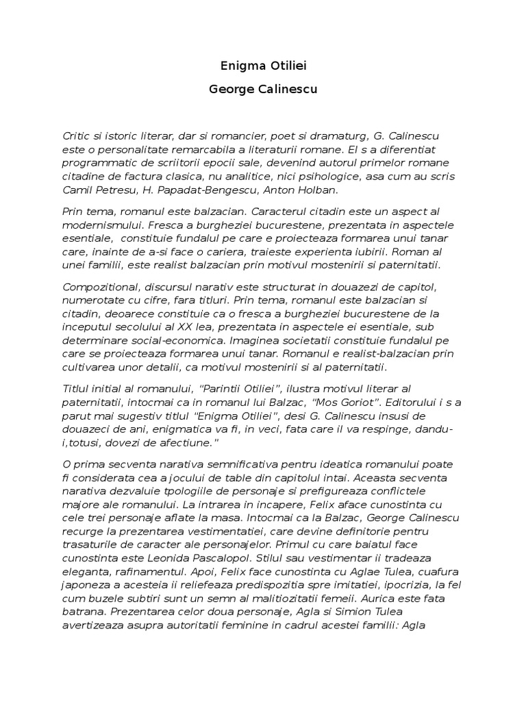 Enigma otiliei este un roman de tip balzacian scris de george călinescu în anul 1938. Romanul enigma otiliei de george calinescu intruneste asadar spiritul clasic balzacian, cu elemente de factura romantica si cu trasaturi puternice ale romanului modern, realist si obiectiv prin introspectia si luciditatea analizei psihologice a personajelor, din care se desprind psihologii. Desfasurarea actiunii romanului enigma otiliei este transpusa prin cele doua mari conflicte dintre familiile lui costache giurgiuveanu si ale surorii acestuia, aglae. Roman balzacian enigma otiliei de g.calinescu (eseu: Opera literara enigma otiliei de g.calinescu este un roman realist cu elemente moderniste, apartinand prozei interbelice.de asemenea este roman balzacian , social si citadin.