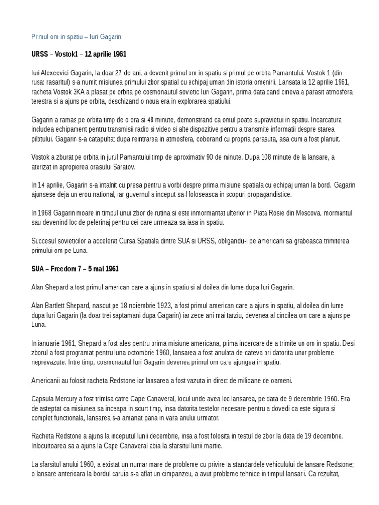 vizitati articolul complet aici : https://www.europafm.ro/56-de-ani-de-la-primul-zbor-al-omului-in-cosmos/ Mai multe echipe, atât rusești, cât și americane, zburaseră deja pe. Misiunea sa istorica a demonstrat ca oamenii pot supravietui in spatiu si a deschis calea explorarilor spatiale. După succesul avut în primul zbor, yuri nu a mai fost niciodată trimis în spaţiu.