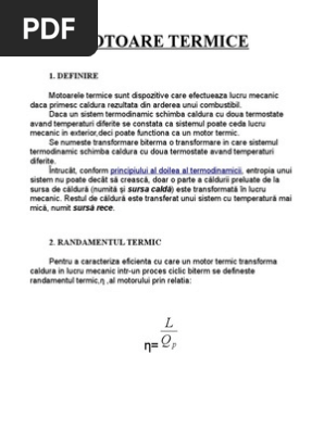 Modelarea teoretică a funcționării motoarelor termice și practic dezvoltarea termodinamicii ca o ramură a fizicii a cunoscut un progres semnificativ după publicarea de către sadi carnot în anul 1824 a studiului intitulat. Un motor termic este o mașină termică motoare, care transformă căldura în lucru mecanic. Descrierea modului de funcționare al unui motor termic în patru timpi pentru automobile.